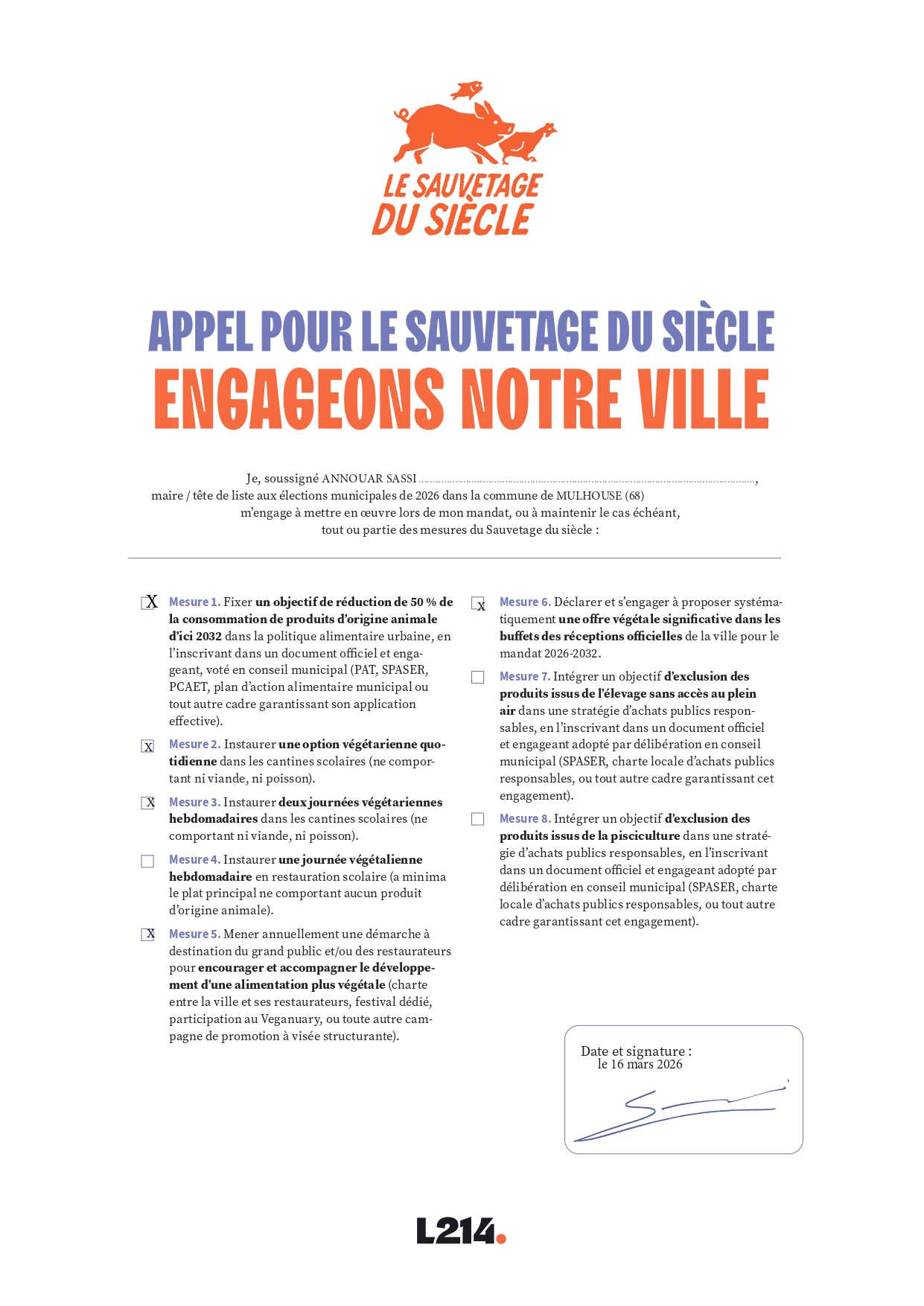 Ainsi, s’engager sur la charte municipale Sauvetage du siècle et mener des politiques de réduction de la consommation de produits d’origine animale pour l’ensemble de la population viserait à épargner 1 000 000 par an, soit 6 000 000 sur 6 ans de mandat !